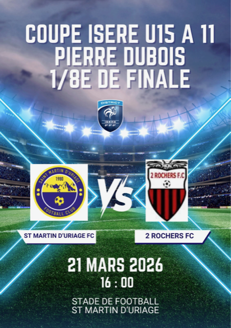 Ce samedi 21 mars 2026 aura lieu le 1/8ème de coupe de l’Isère (Pierre Dubois) U15. Le match aura lieu au stade mytique de St Martin d’Uriage contre l’équipe des 2 rochers (ST Egrève) qui évolue en D2. Mais rien ne fait peur à notre équipe qui a déjà éliminé Goncelin D2 au tour précédent 5-4. Venez nombreux comme d’habitude encourager cette superbe équipe de SMU.